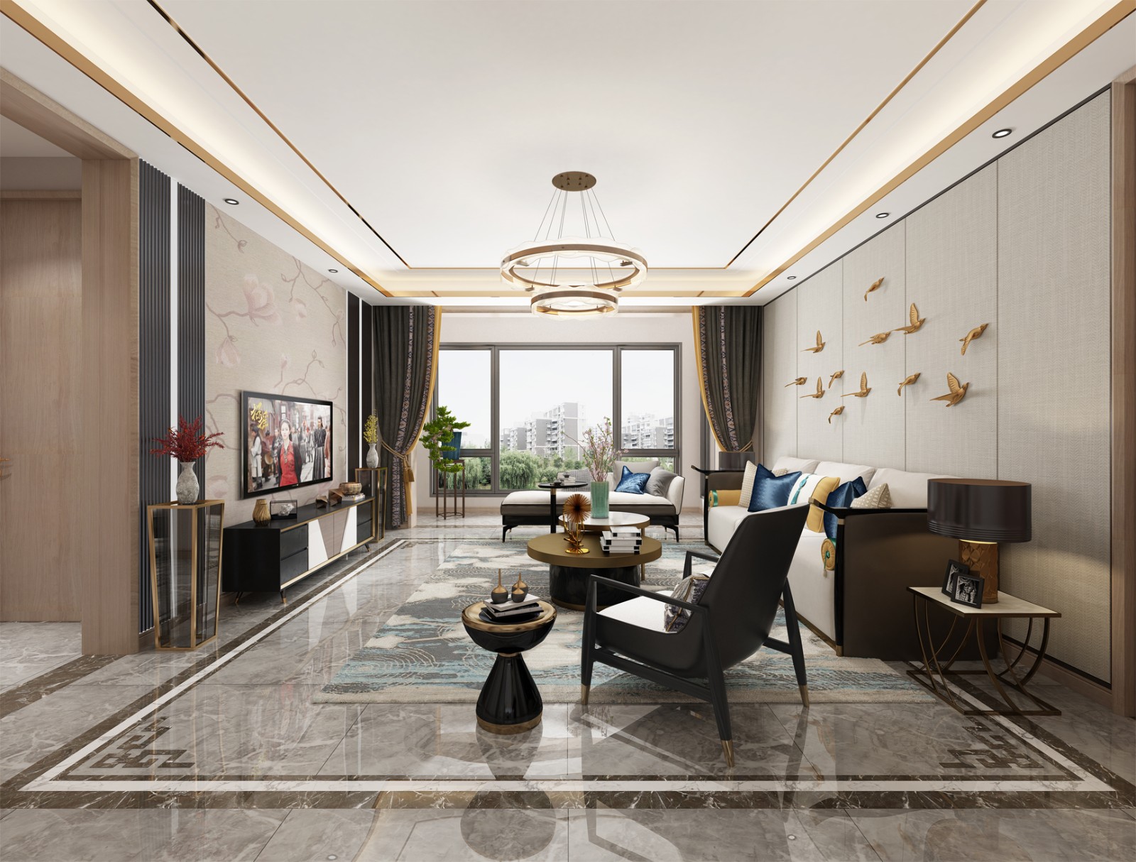 整体材质色调搭配,主题以东方柔美为主,电视背景墙,玄关背景、壁画都以比较柔美的中式壁纸来搭配,地面采用回字纹拼花造型,寓意吉祥如意、财源广进,也更能搭配中式特征