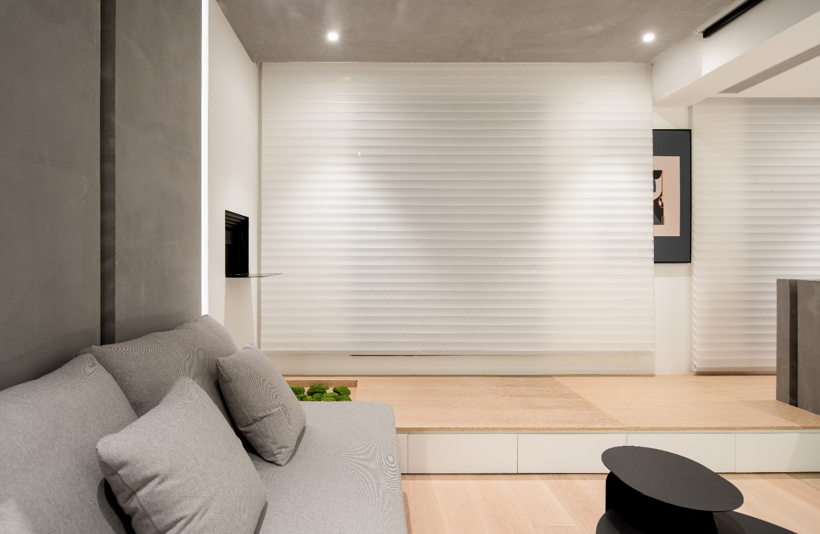灰色的绒面沙发与整个水泥灰的背墙融为一起,墙面以圆弧留缝进行了分割,打破了空间一灰到底的沉闷之感。