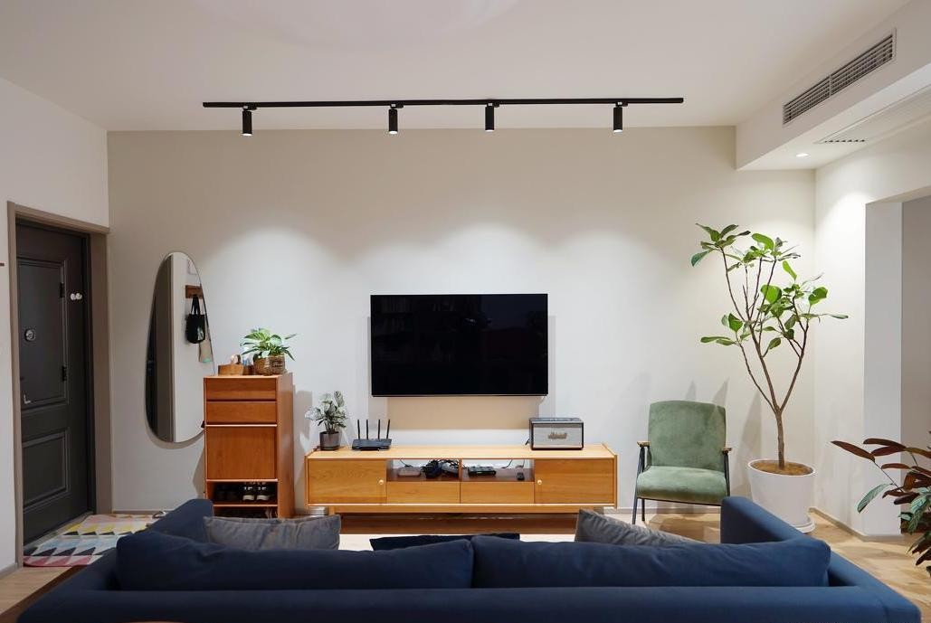 简洁的电视墙,樱桃木的家具总是能给人很温馨的感觉,电视柜和鞋柜高低组合的搭配,全身镜像一滴水,把各种功能性的东西在造型上结合好,就可以很有陈设感。