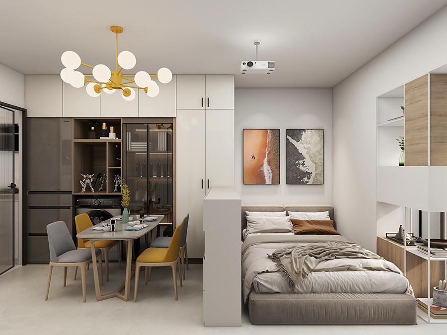 客户要求一家三口居住,想要独立餐厅的空间,增加储物空间。该户型改了厨房门的位置,避免孩子床直对厨房门,大人床旁边的矮柜既保护了隐私,又增加了储物。