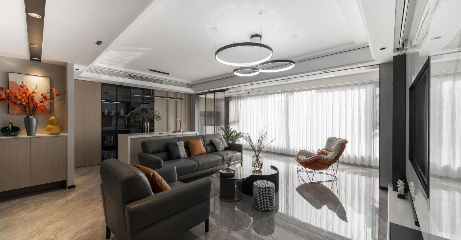 长虹玻璃的局部隔断,塑造出朦胧的美感,材质、光影、空间三者交互,呈现出自然且温润的共存关系。