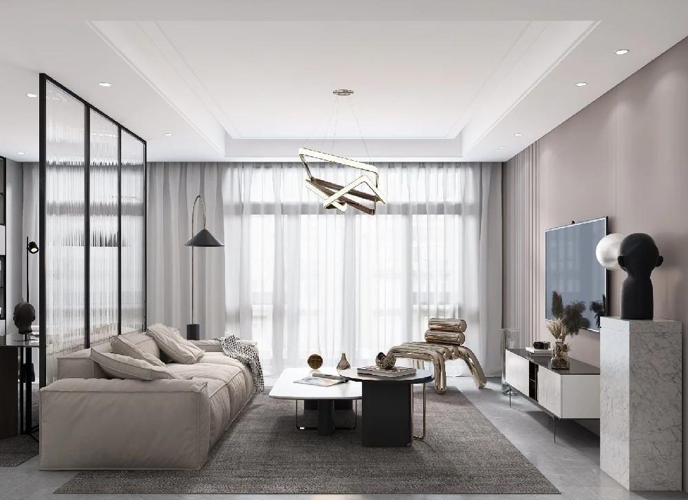 看向客厅,室内简洁实用至上,回归到最纯粹的生活功能上,客餐之间设有长虹玻璃,作为隔断。