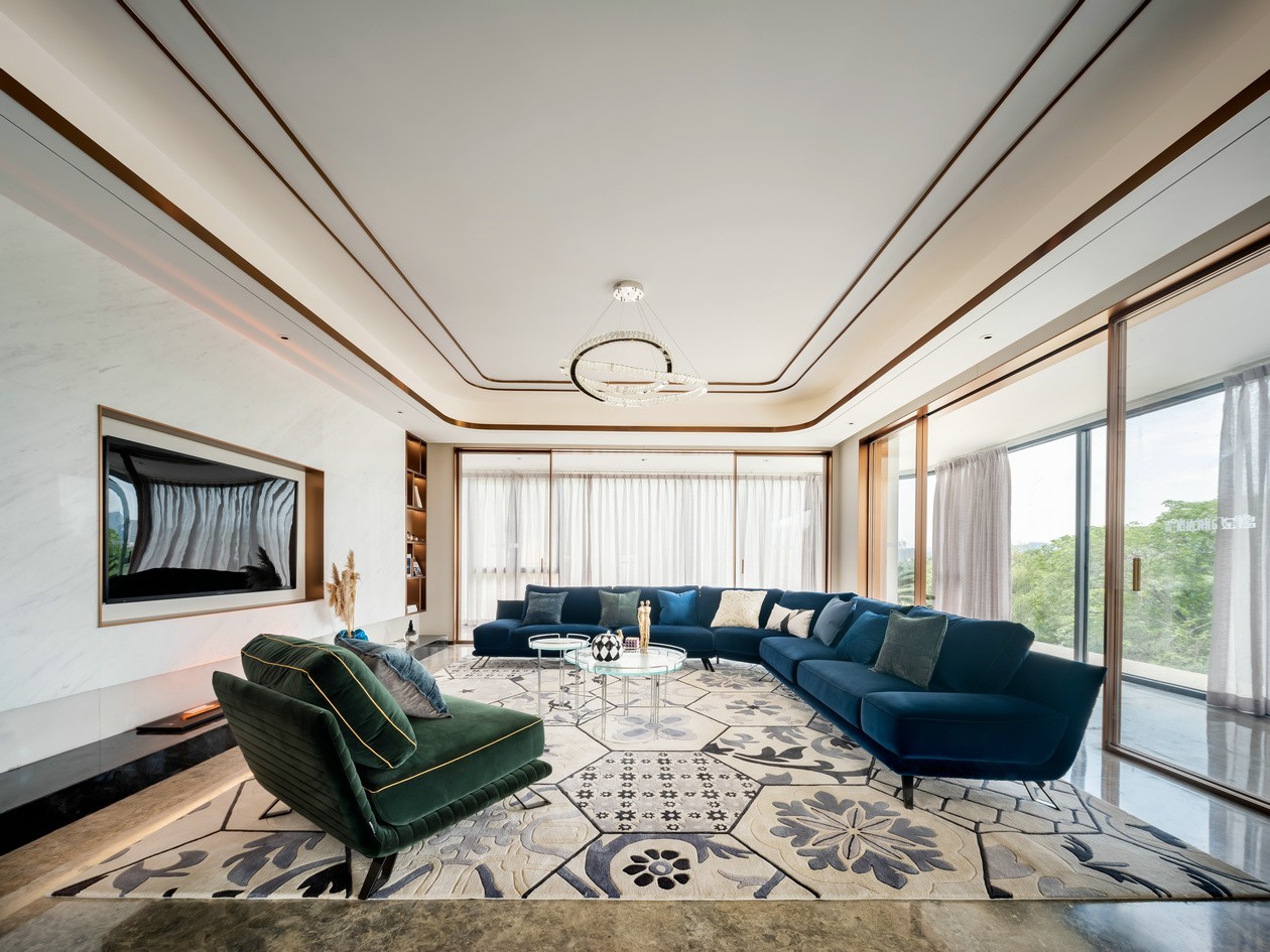 客厅的布局以白色搭配金边为主,突出精奢品味,蓝绿两色沙发使整个客厅空间活跃起来,沙发绒面材质也增添了品质感。