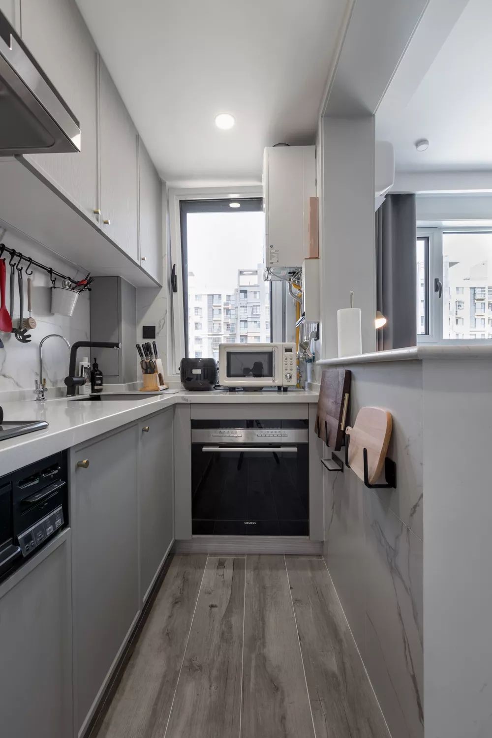 厨房内部是做了L形的橱柜布局方案,半墙后方也被利用起来,挂一些砧板、锅具等物品。浅灰色的橱柜看起来轻松而又时尚。