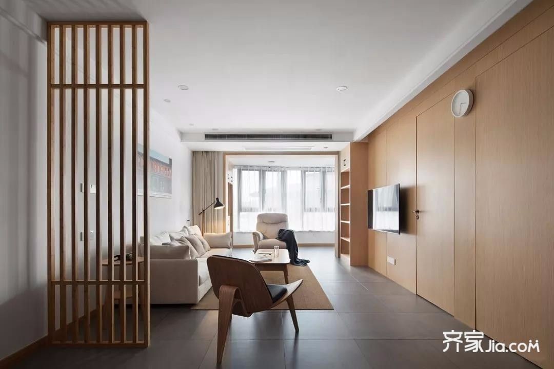 客厅空间整体简约大方,以灰色地面砖搭配木质电视墙与屏风,呈现出一个自然舒适的空间感,木制屏风的设计,避免大门直对阳台的问题,也增添了客厅的隐秘性,米白色布艺沙发搭配木质茶几,还有一张木质懒人椅,剑麻地毯和空间里的木质色系相同,深灰色的水泥砖衬托木材的温润质感,背景墙一幅意境油画,和这样宁静平和的场景,混搭出了不一样的感觉,餐厅的背景墙连着客厅电视墙,木质的墙面与定制柜让空间显得自然大方,空间的照明