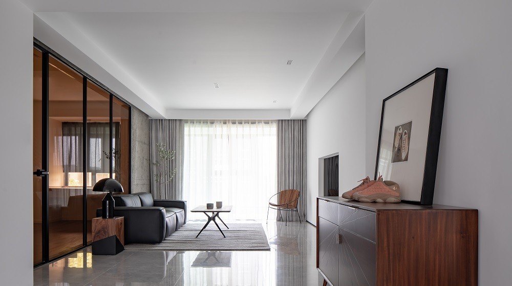 该户型是一个三室两厅两卫的户型,业主是一位「潮鞋达人」,我们希望把男主人对潮鞋的追求和信仰,具象成生活中的仪式感,用自由洒脱的玩乐心态去面对生活。