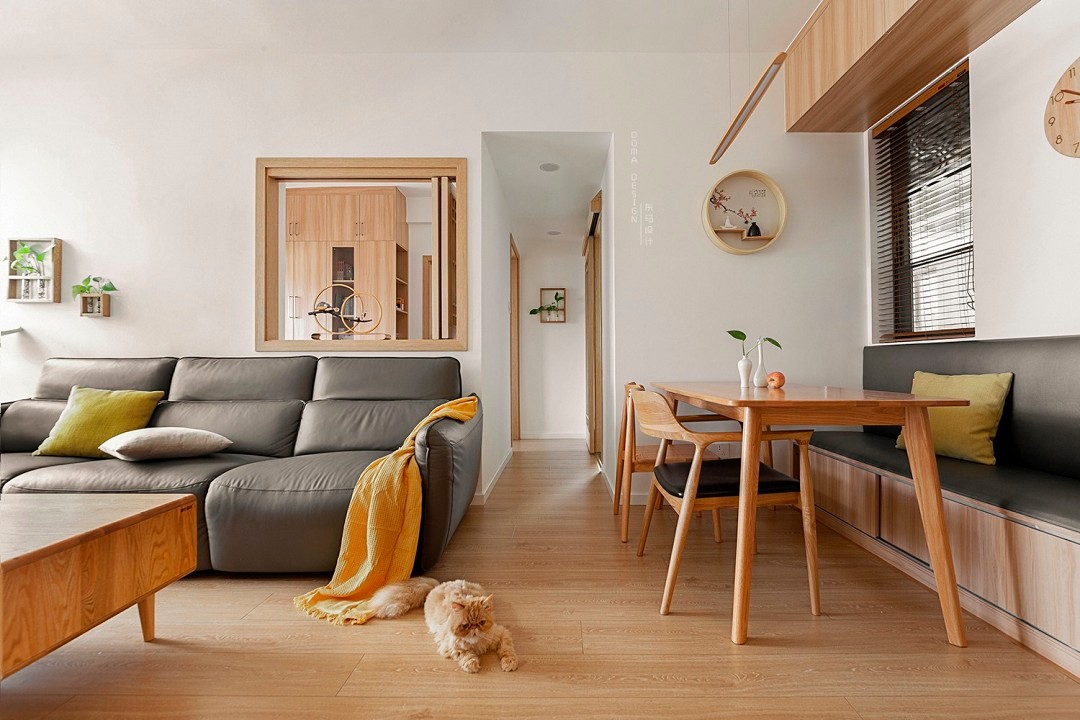 勘测时发现楼层高度低、改造可能性比较大,但装修资金又有限,房子设计主要是以父母居住为主,还有一只陪伴了十几年的家庭成员(猫宠),自己周末会来小住。考虑到父母居住,木色能够更好地营造温暖的居住空间,因此木色系的设计风格成为***。父母年纪大了,在大城市里的生活环境老人家更希望是休闲放松的居住氛围,通透又便于家人间亲密交流,活动性较大、流动性的空间,更好地颐养天年。同时猫也可以随处走动,随处可见其身影