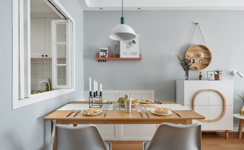 在现有的空间,使用卡座式的餐桌,还增添储物空间。