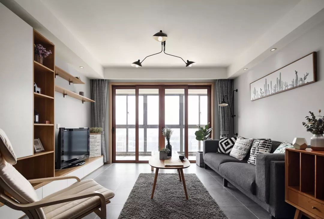 客厅以灰色调地砖与低碳,搭配灰色布艺沙发与木质的家具柜体,营造出一个自然舒适的客厅。