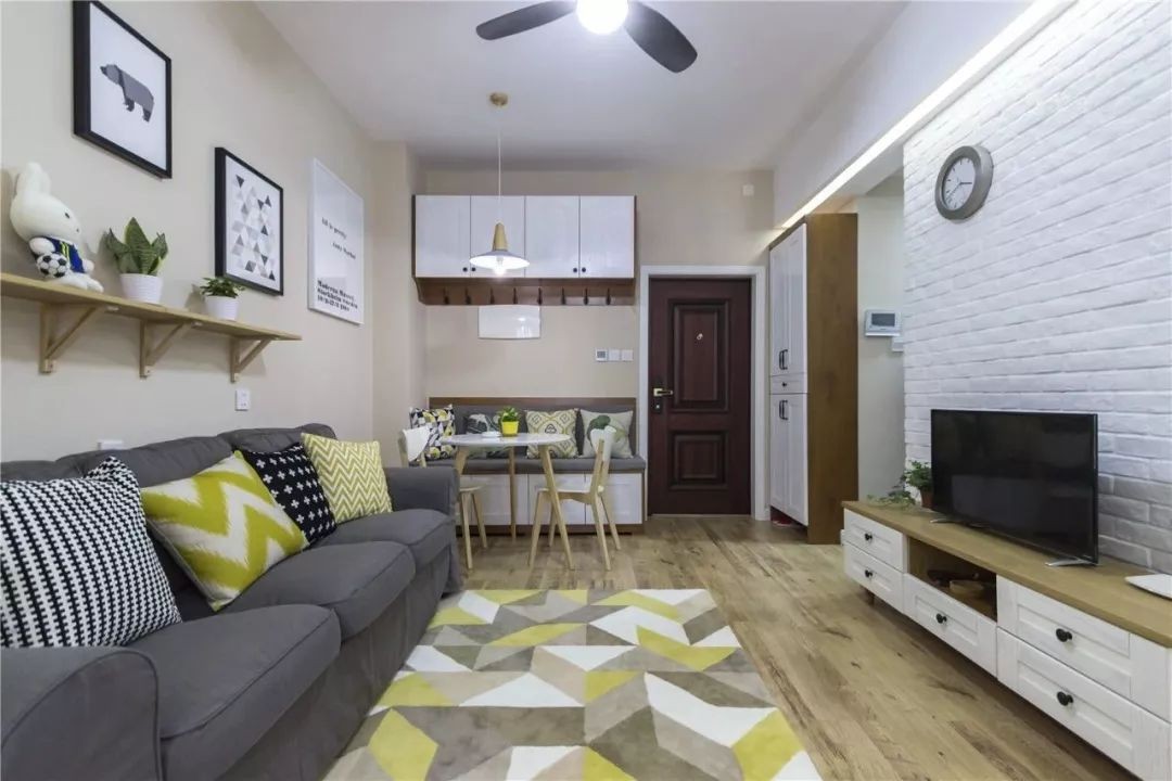 客厅空间较为紧凑,电视墙以白色文化砖为主,挂一个圆形挂钟,整体简单的电视墙,显得精致文艺,惬意自然。