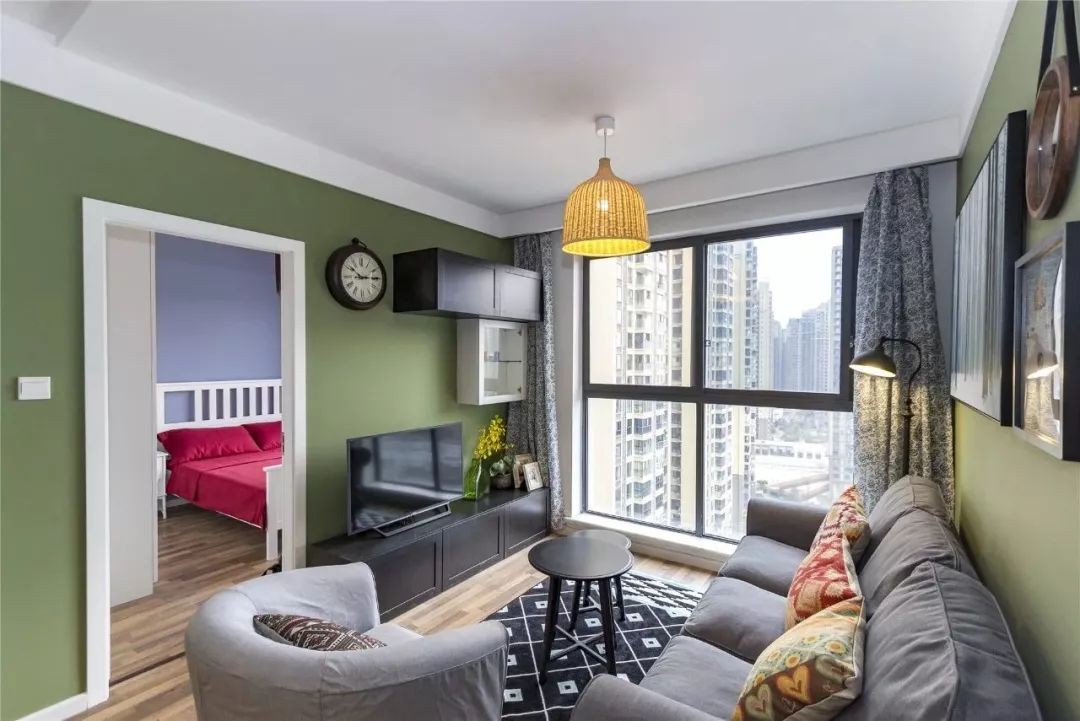 沙发墙茶绿色的基础,挂上一组装饰画,搭配灰色布艺沙发与圆形小边几、茶几,整体简单的空间也显得安静舒适,闲坐沙发上眺望窗外川流不息的车流,慢慢地感受时间的流逝。