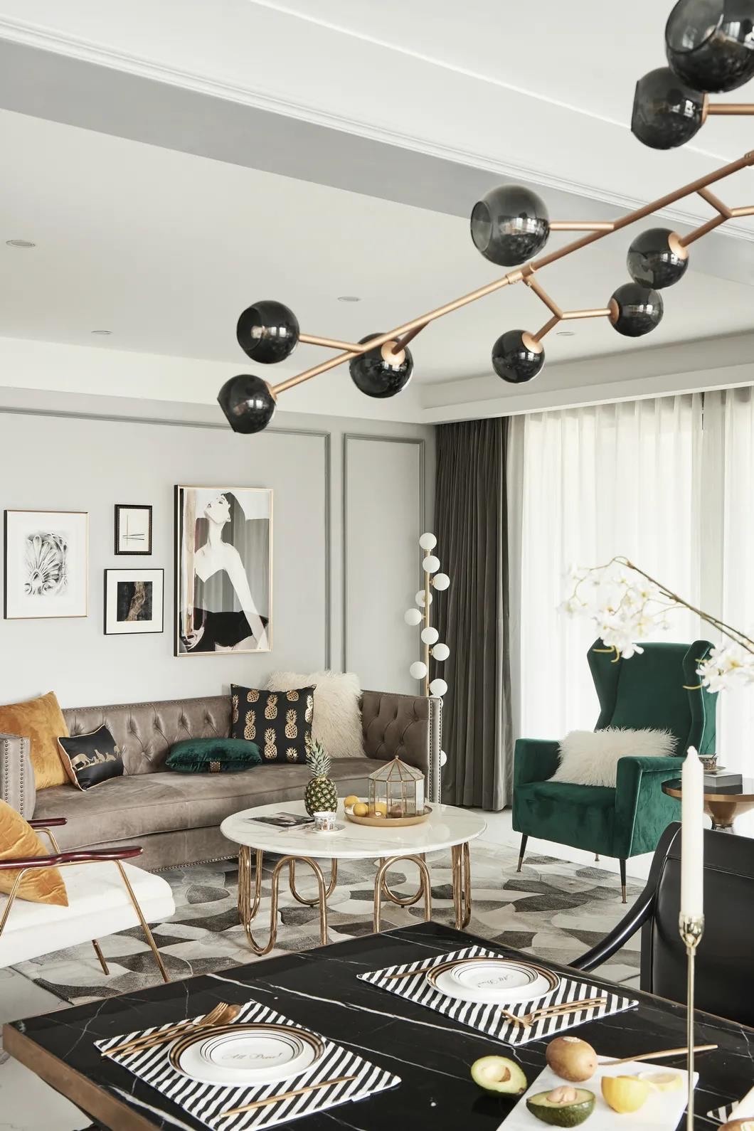 本案在这套110平米左右的房子中,整体空间以简约灰的美式风格硬装基础,加上轻奢质感的家具细节,使得空间充满华丽优雅而时尚大方的氛围感;而开放式的厨房+餐厅布局,加上稳重深色的餐桌椅布置,也让这个空间显得更加宽敞有档次。