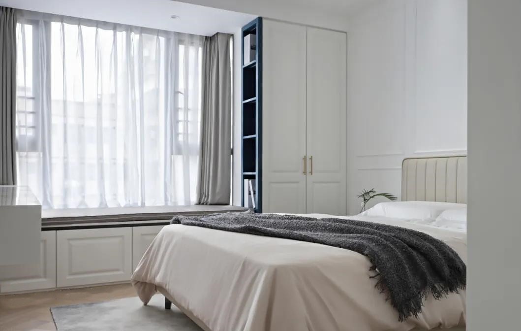 客厅是宽敞大方的格调,依旧是白色的主色,点缀蓝色的窗帘和沙发。作为重要的交流和会客空间,在功能和美学上都达到了统一。纳入自然光线的大面积玻璃窗,让光线在空间中肆意流淌,时间缓步前行