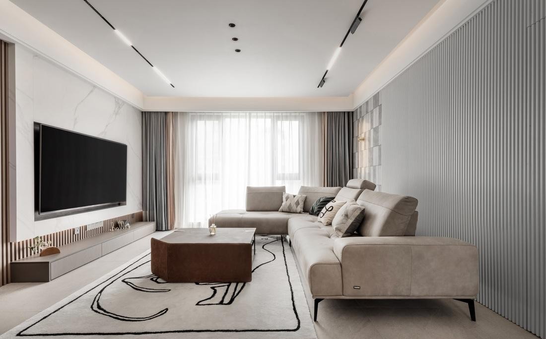 室内通铺低饱和度大砖,为空间注入柔和温暖。无主灯设计,见光不见灯,视觉上更显层高,4000K的色温,保证光线柔和的同时不会影响照明效果。隐藏筒灯和磁吸灯的分布,考虑到人在空间中的活动,设计更显人性化。