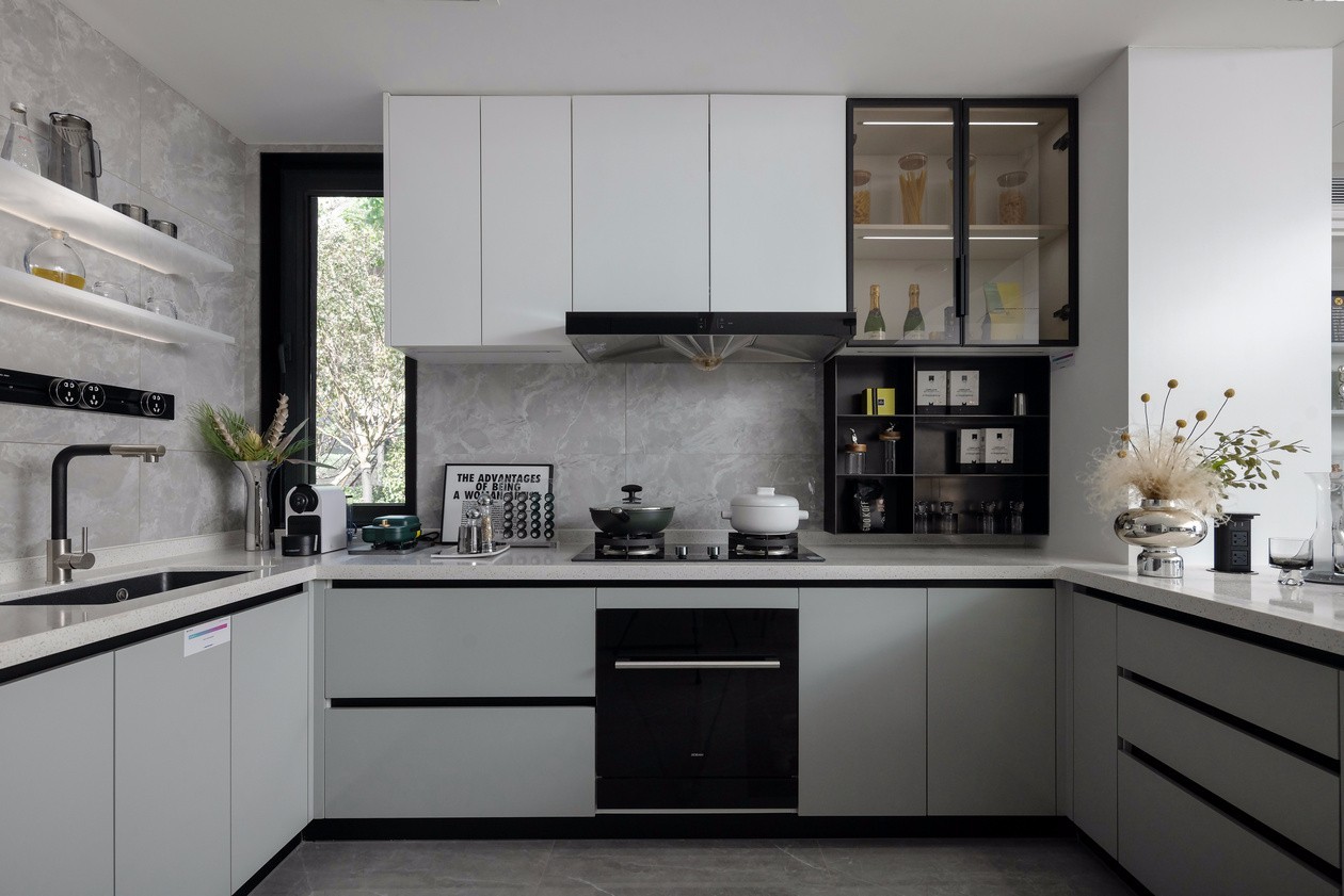 餐厅旁侧的开放式厨房设计简约实用,U字形柜体满足小家庭日常烹饪所需。因地制宜的墙面置物架,让厨房操作更便捷,充满主人精细操持储物的痕迹。