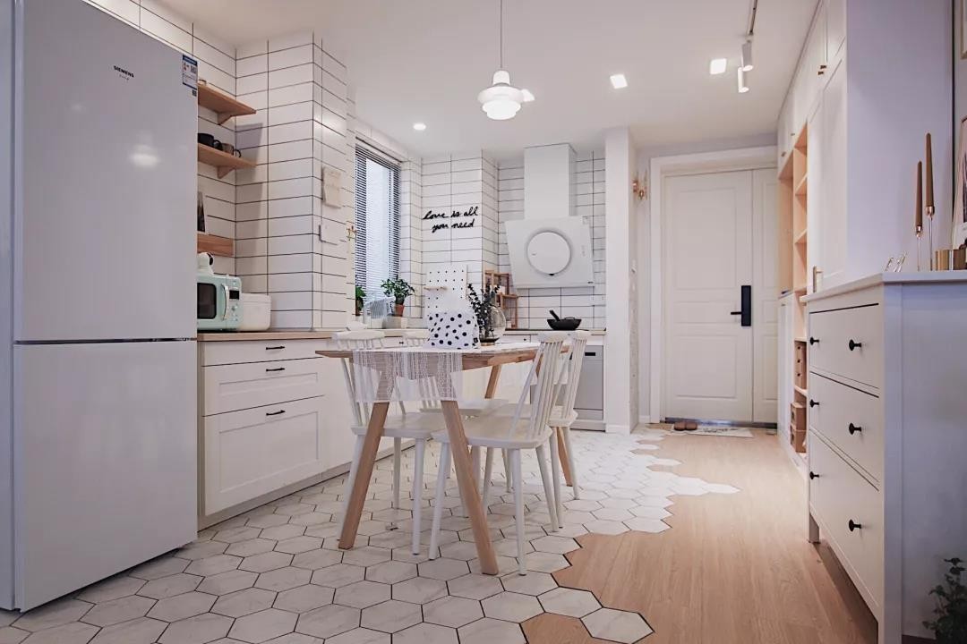 厨房是L形的橱柜布局,墙面没有吊柜,搭配一些简单的收纳。餐桌椅摆放在了六边砖的区域内,白色六边砖和木地板混拼的设计让人感觉趣味十足。