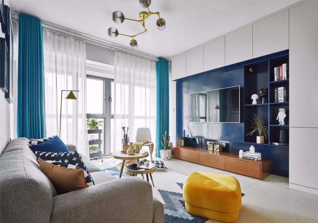 客厅以白蓝两色为主色调,辅以柠檬黄及绿植进行点缀,整体清新又亮眼。