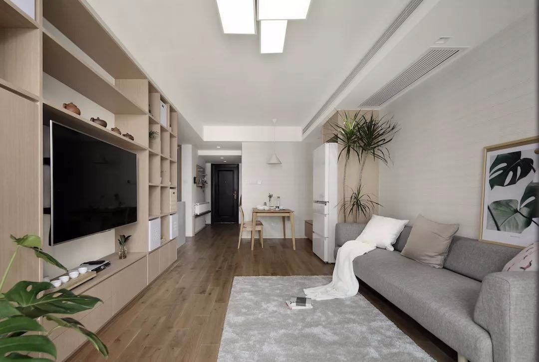 电视墙设计成转角的L字形大书架,可无限的收纳书籍及其他物品。原木色和大白墙搭配也非常好看