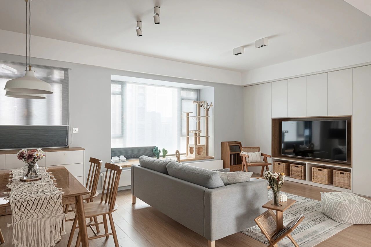 客厅看似随意的家具布置,透露着轻松闲适的慢生活节奏。电视墙直接尺寸定制,提前做好电路布置,正面没有多余的线露出来,整体美观实用。