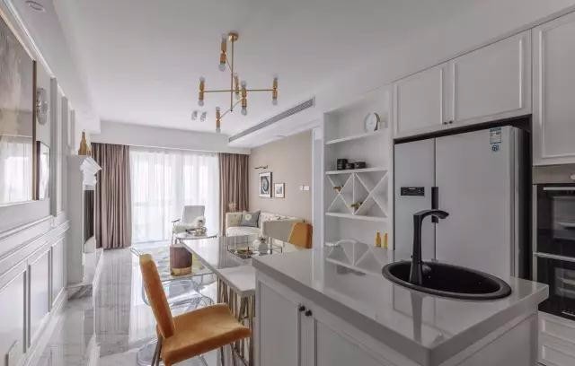西式厨房与餐厅一体,开放式的厨房更时尚,在家也能享受牛排红酒的浪漫。白色台面便于清扫。嵌入式的冰箱节省空间的同时又实用。