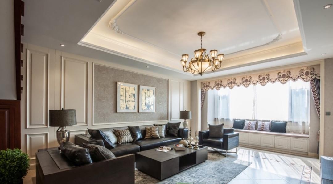 圆弧雕花吊顶设计感十足,使空间感更强,自然下垂的顶灯+隐形灯带的设计使照明显色极高,照亮整个空间。真皮沙发、方桌、地毯以及绿植,让客厅空间充满了自然、自在、自由的生活氛围。