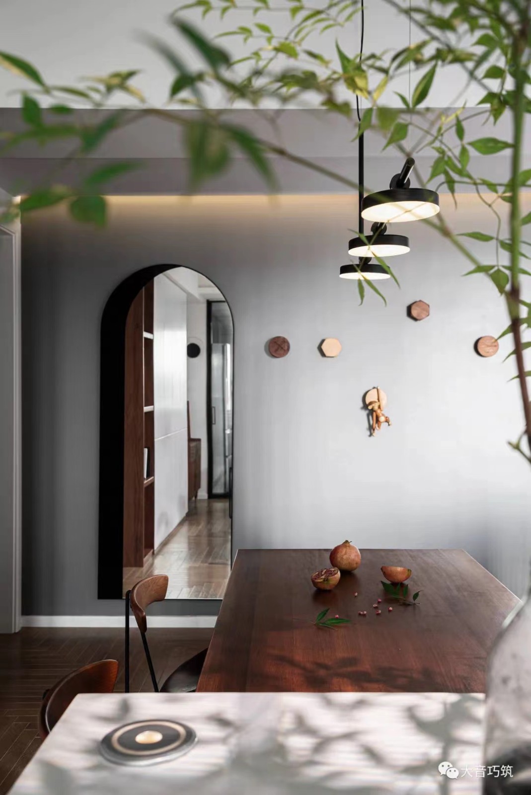 门厅区域的原木挂钩高低错落,十分有心机的将空间纵向拉伸,电视背景墙一端的三盏吊灯有序排列,为整体感官再进一步,形成视觉上的多维立体效果,丰富了空间的视觉表达。