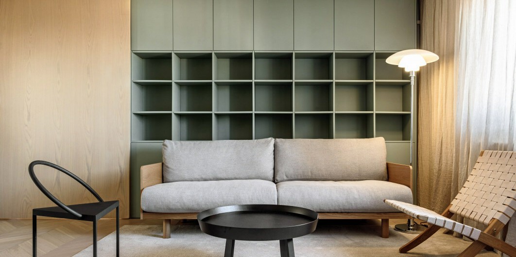 沙发背后的储物柜选了灰绿色,为了让空间有一点清新的色调 家具和硬装的彩色和材质非常统一,橡木色,暖灰色,黑色的组合