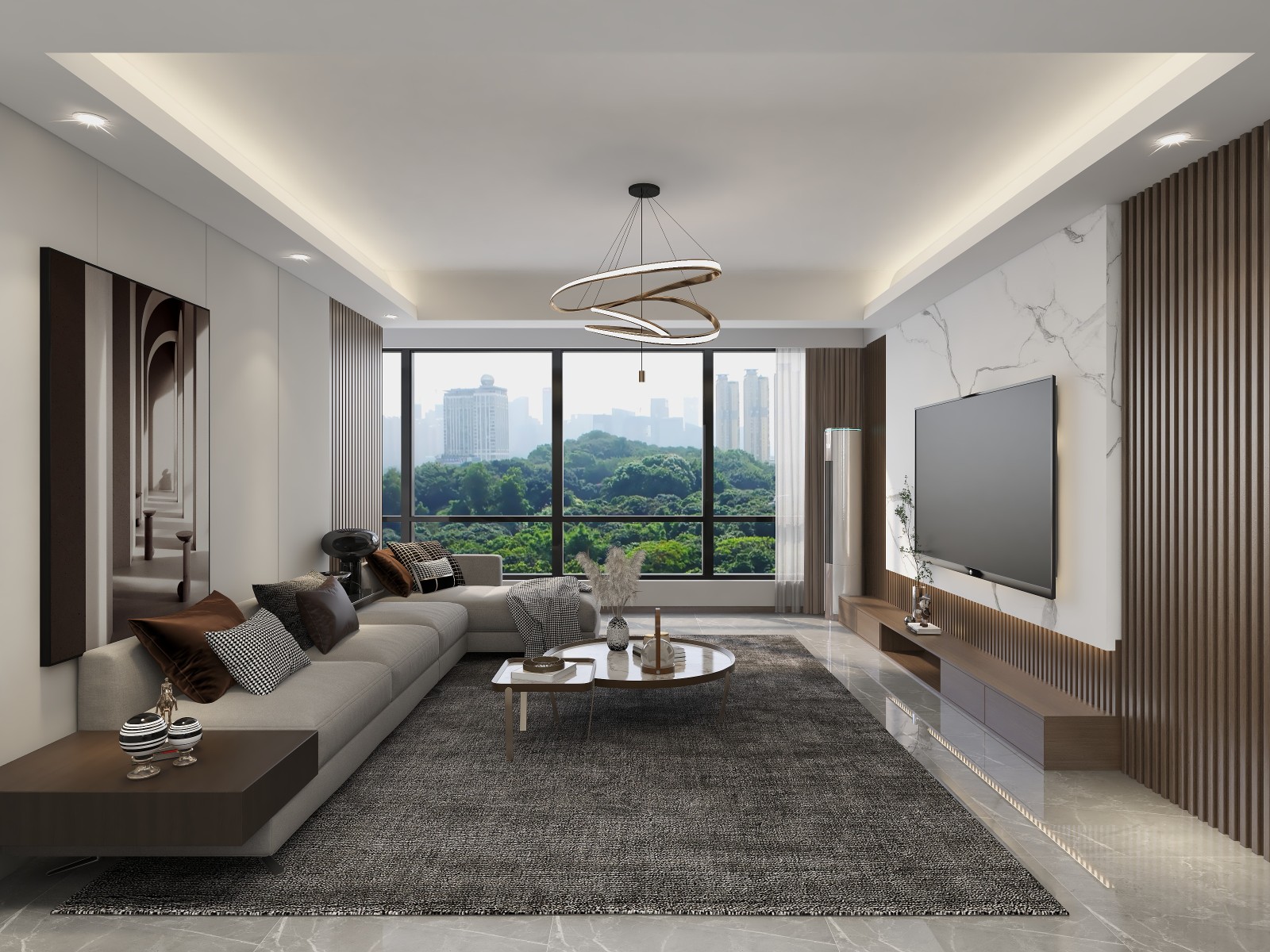 边吊,岩板+格栅做电视背景墙。