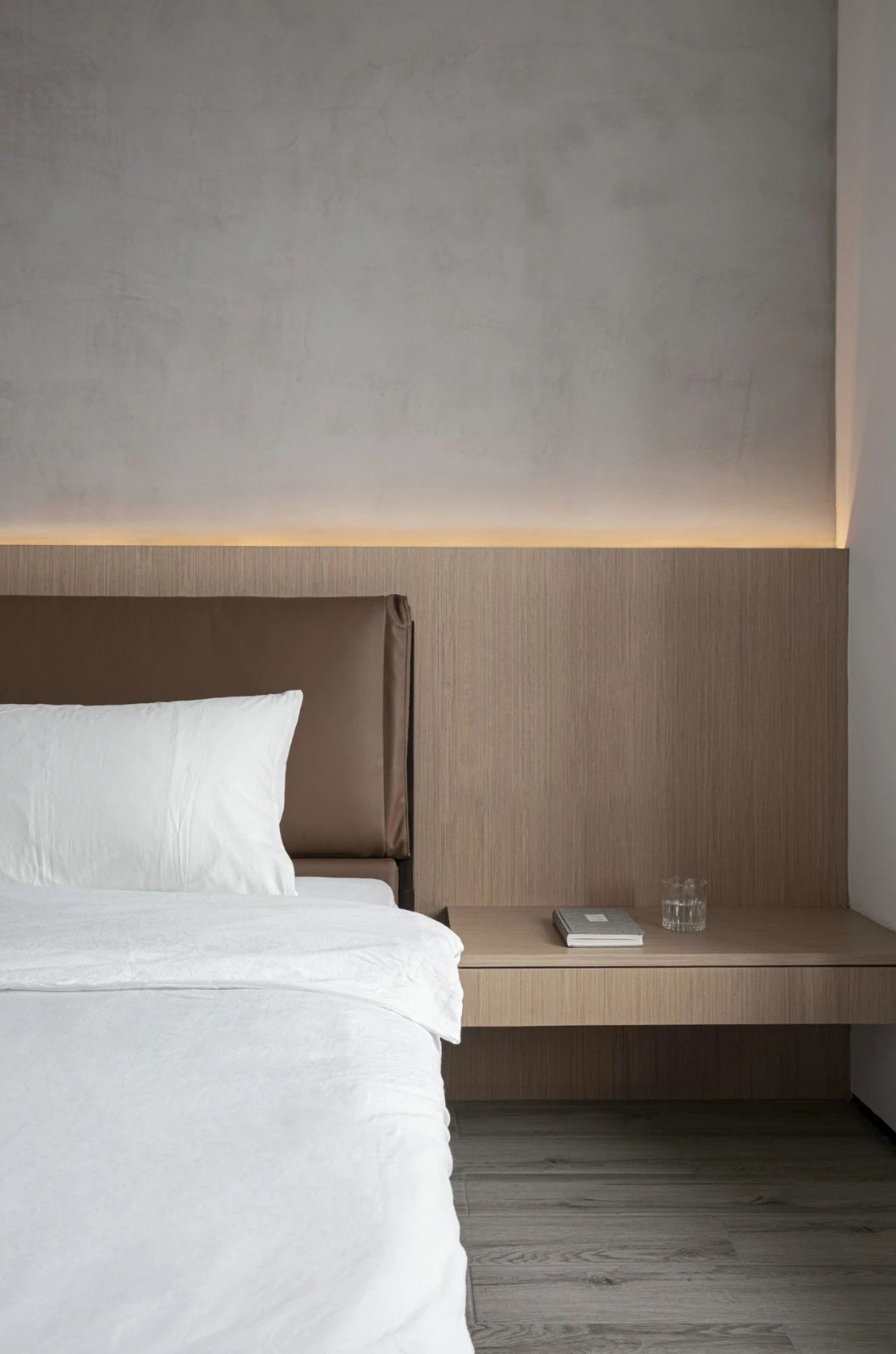 卧室延用木饰面和水泥漆,床头背景墙内藏灯带,丰富层次感,空间静谧治愈。悬挂式床头柜,极简精致,同时也避免卫生死角。