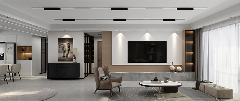 色木格栅加上木色木饰面简单大方;超长空调风口更显大气;玻璃柜门酒柜虚实结合。