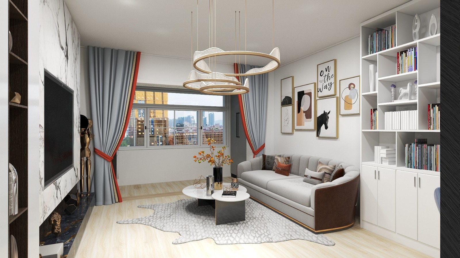 简约大气的客厅,岩板搭配格栅木作的电视背景墙。