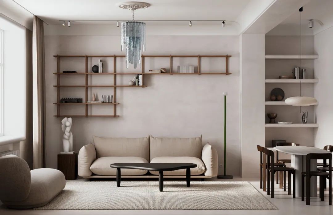 将客厅在墙体上做了隐形分区,使餐厅纳入客厅中的同时又保证了功能区的明确。客厅木质置物架设计兼具美观和轻盈,米色沙发凸显了空间中颜色的层次感。趣味性十足的艺术装饰品为这里增加了一丝生活的情致,整体设计上迷人有有趣。