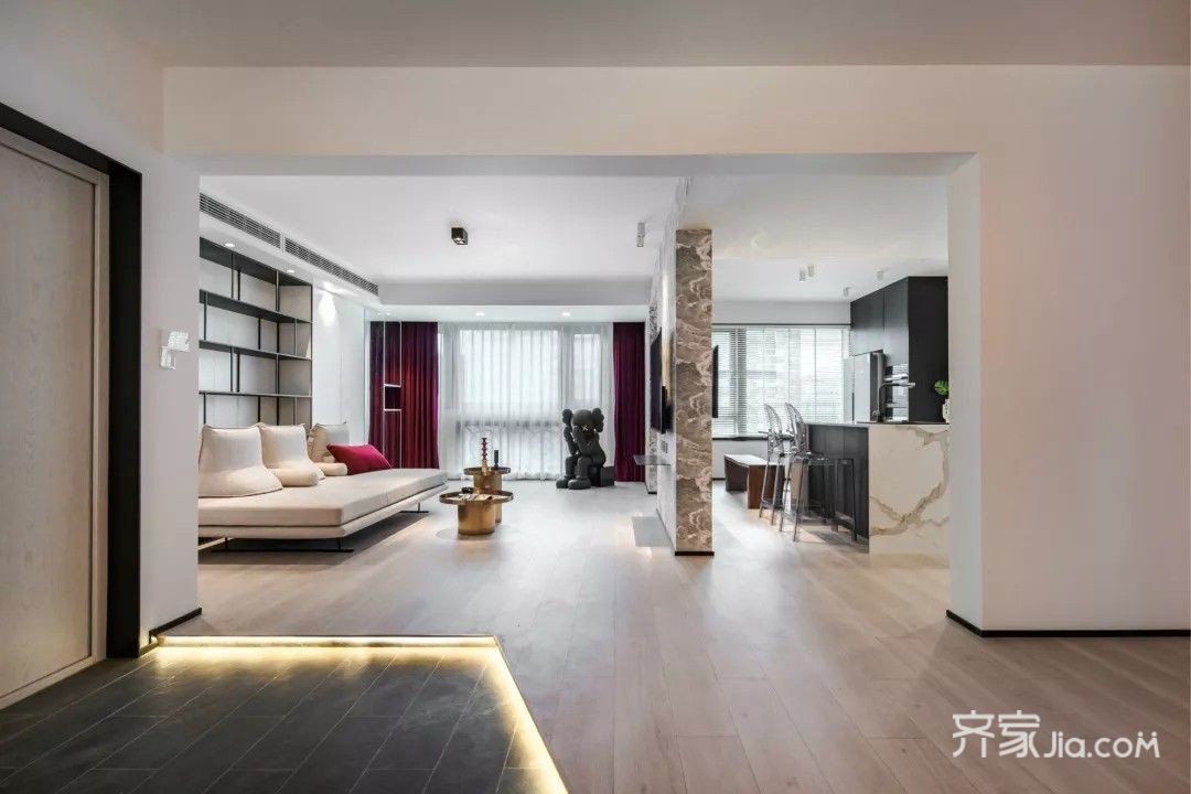 穿过玄关,便是开放的客厅、餐厨区域, 设计师没有用太多物理隔断去划分, 从颜色上就能一目了然。
