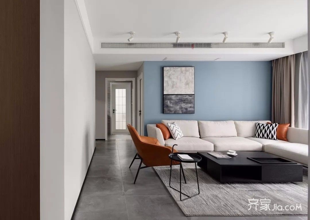客厅沙发墙刷成安静的素蓝色,挂上一幅灰白调的简约装饰画,一套米白色布艺沙发+橙色沙发椅,还有黑色的大茶几,整体搭配时尚又活力。