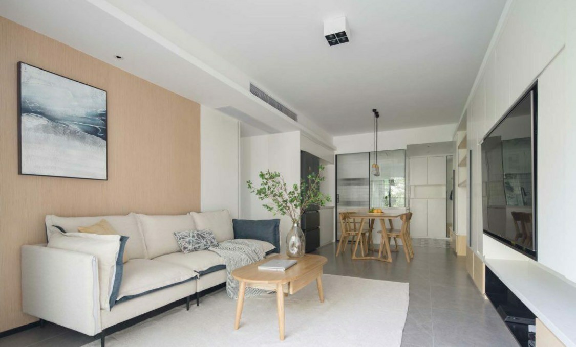 布艺沙发和原木色调的背景墙,与家具相互呼应,保持了空间的一致性,呈现一种舒适温馨,明亮通透的感觉。