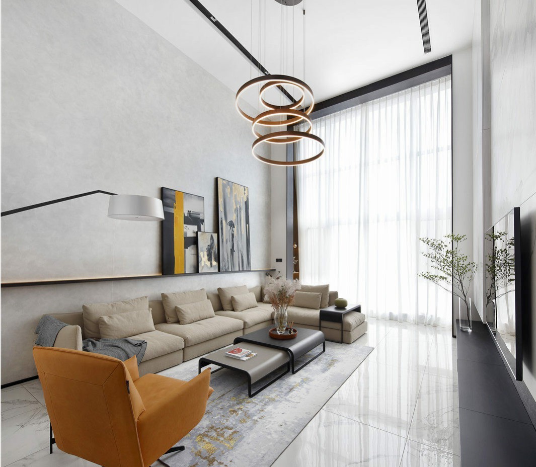 避免背景墙的单调,上置发光搁架,摆上装饰画,大面积落地窗引入光线;阳台被打通,垭口处使用黑色烤漆围护封边,配合吊顶轨道灯和隔板,现代的精致感