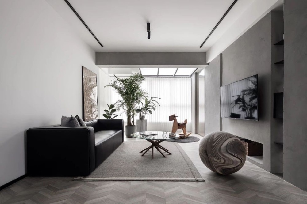 鱼骨拼地板和艺术水泥漆碰撞中和, 树皮装饰画同阳台的绿植遥相呼应, 黑色皮质沙发正合业主想要的男人气概, 同时简约的气质和整个家的格调也甚是相配。