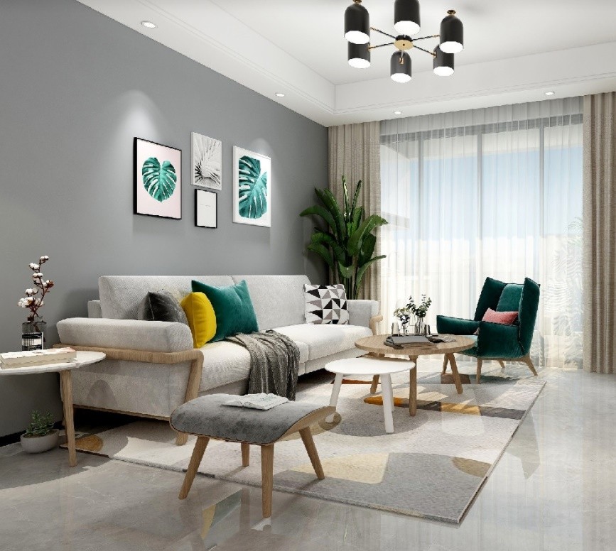 沙发背景以大面积的灰色作为空间主色墙去搭配宜家风格的浅色家私,增加空层次感以及休闲放松的氛围。