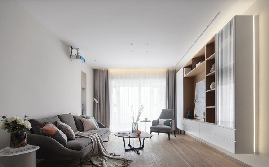 客厅没有做传统的电视背景墙,用了一个收纳柜的形式,作为客厅的一个视觉点。投影幕布在吊顶前做了预埋,完美的融合在吊顶里。柜子用了三种不同的材质来增加设计的层次感