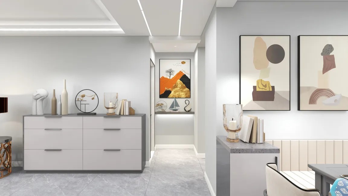 客厅墙面***调色,搭配壁画软装柜子,时尚简约