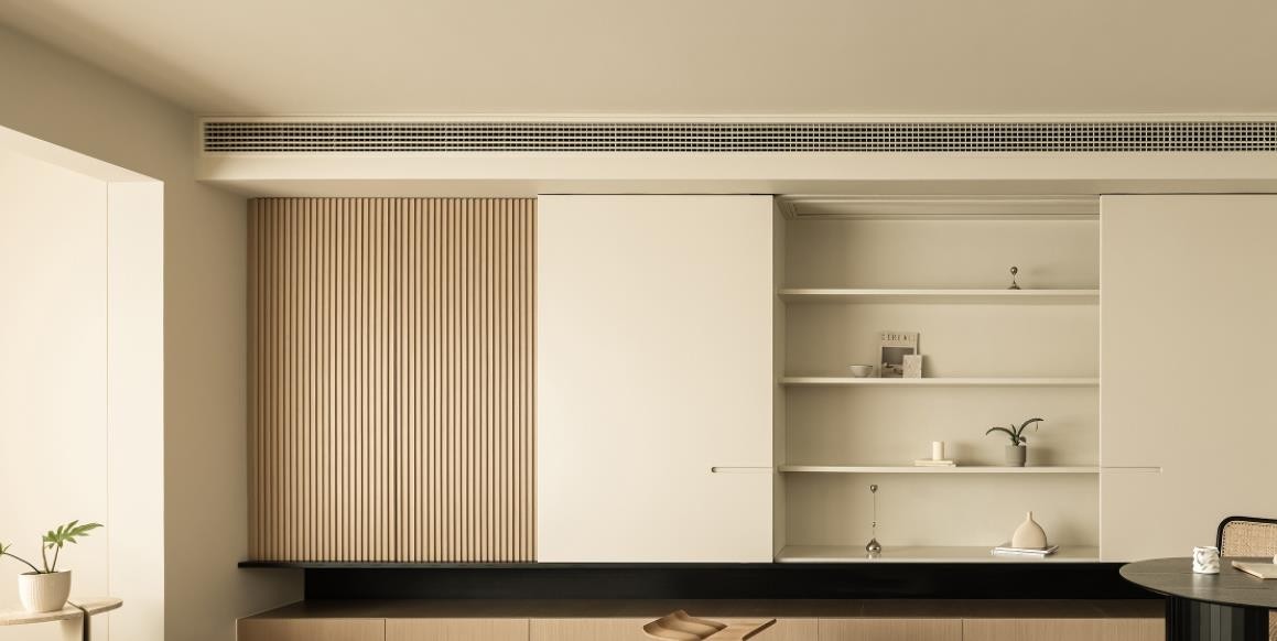 承载着大容量收纳的柜子也一定要以高颜值的形式存在,移门打开可以遮盖所有收纳柜的门缝并且能更好展示主人的日常收藏的饰品。风格微暖,宅家不乱,设计还原真实生活