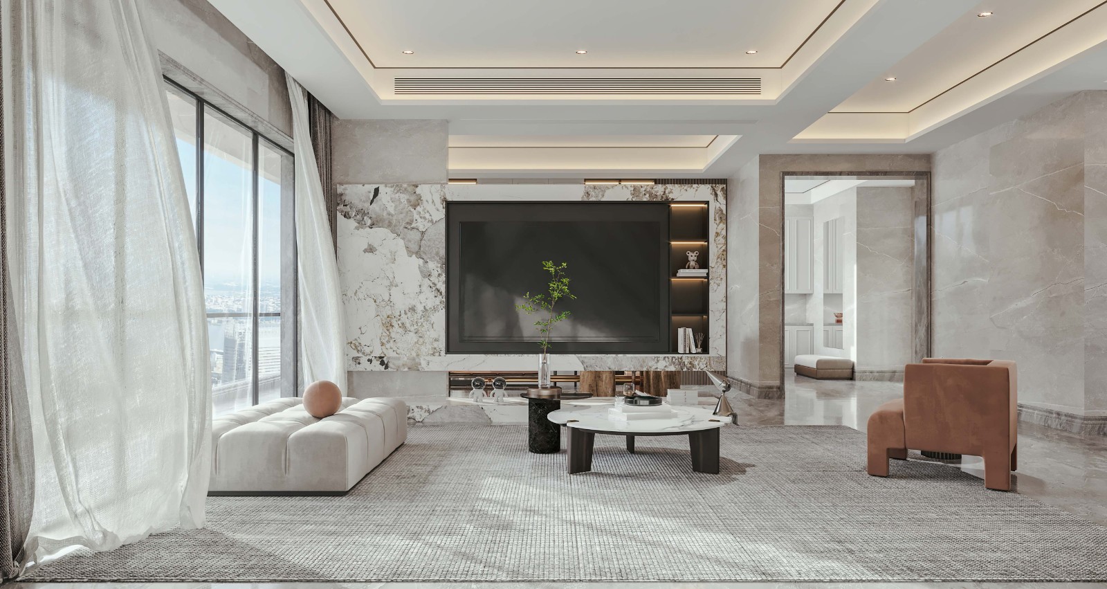 150㎡现代,整体以现代风格的空间基调,在空间里加入大量的硬包板与大理石纹理,整体以现代风格的空间基调,在空间里加入大量的硬包板