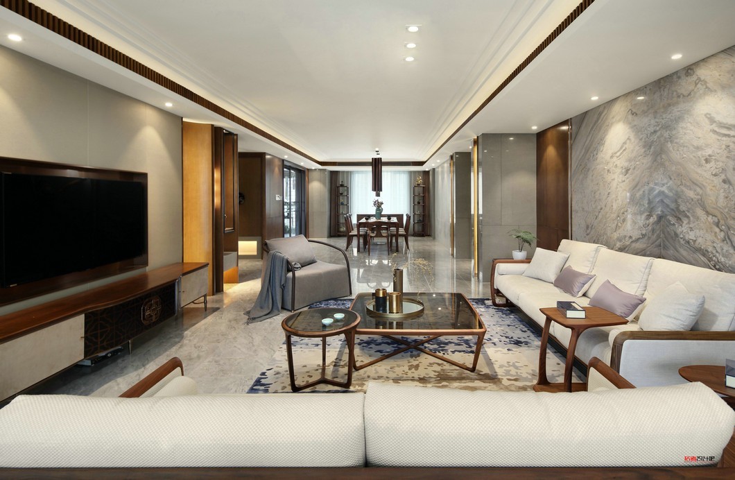 间为三居室,但是设计师以“形散神聚”的艺术形式,将古典元素淋漓尽致地呈现出来,不管是吊顶的石雕、还是墙面的几何线条,抑或是复古的金属质感的家具,都在以不同的形式,将新古典设计的华丽和奢贵留驻在空间内,让主人随时都能感受到一股力量;空间中始终保持着它独有的唯美之风,令众多高端人士追捧厚爱,从经典的色彩搭配到传统的历史文化的底蕴穿插,大量的复古家具和配饰、灯具起到了点缀的效果,精致之中把生活和艺术融