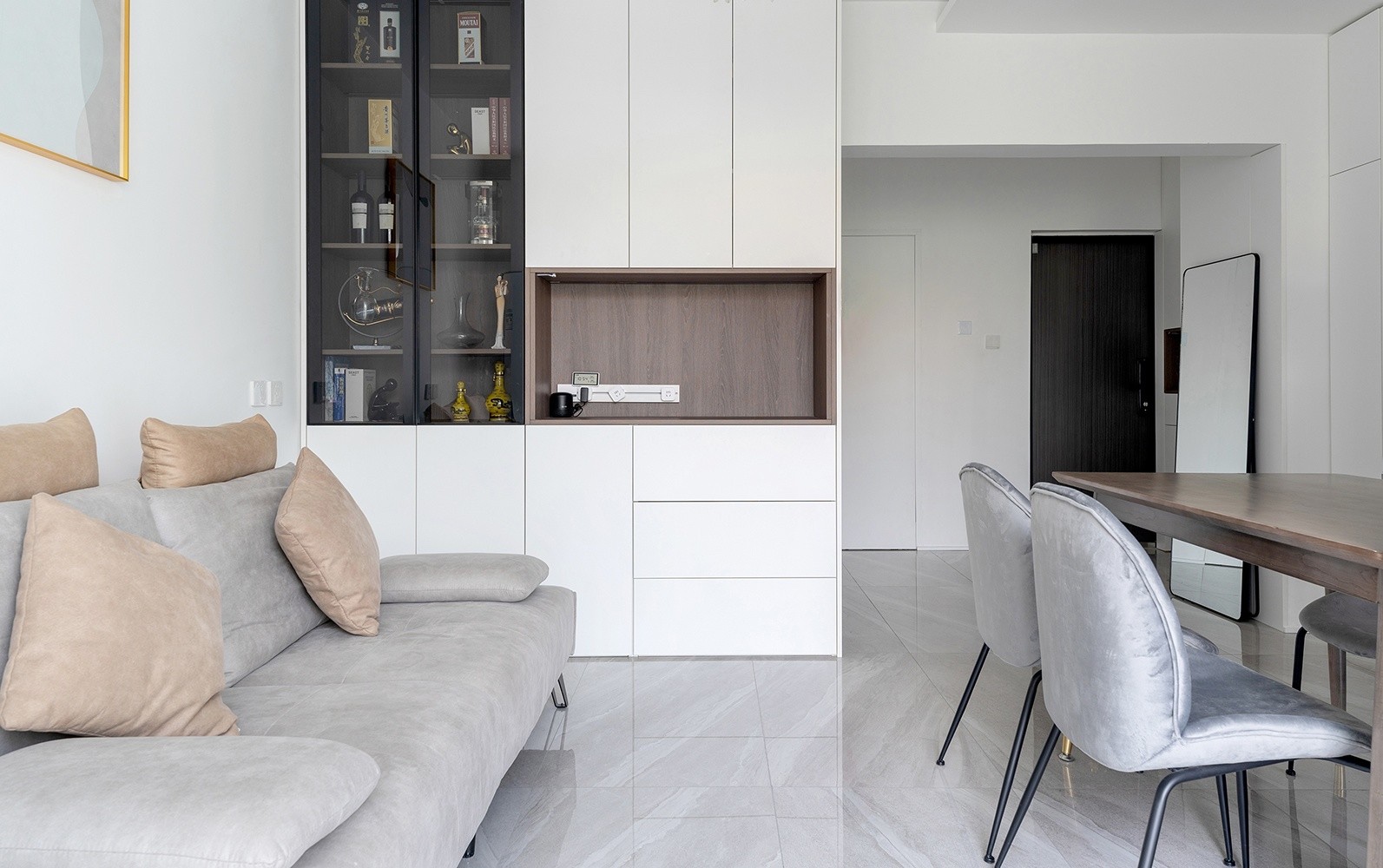 为保证空间整体层高,没有做太多的吊顶。沙发的旁边安排了一组收纳,来满足展示和备餐需求。暖灰色的亮光砖有放大空间的效果,营造简洁随意的氛围。