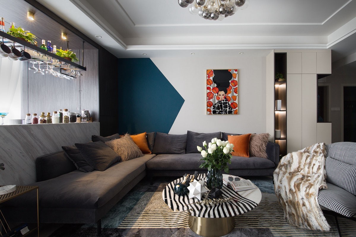 客厅背景墙的造型通过巧妙的色彩搭配令空间质感更为饱满。软装方面,细节的撞色、金属材质的家具配饰将低调奢华的格调表达得淋漓尽致。