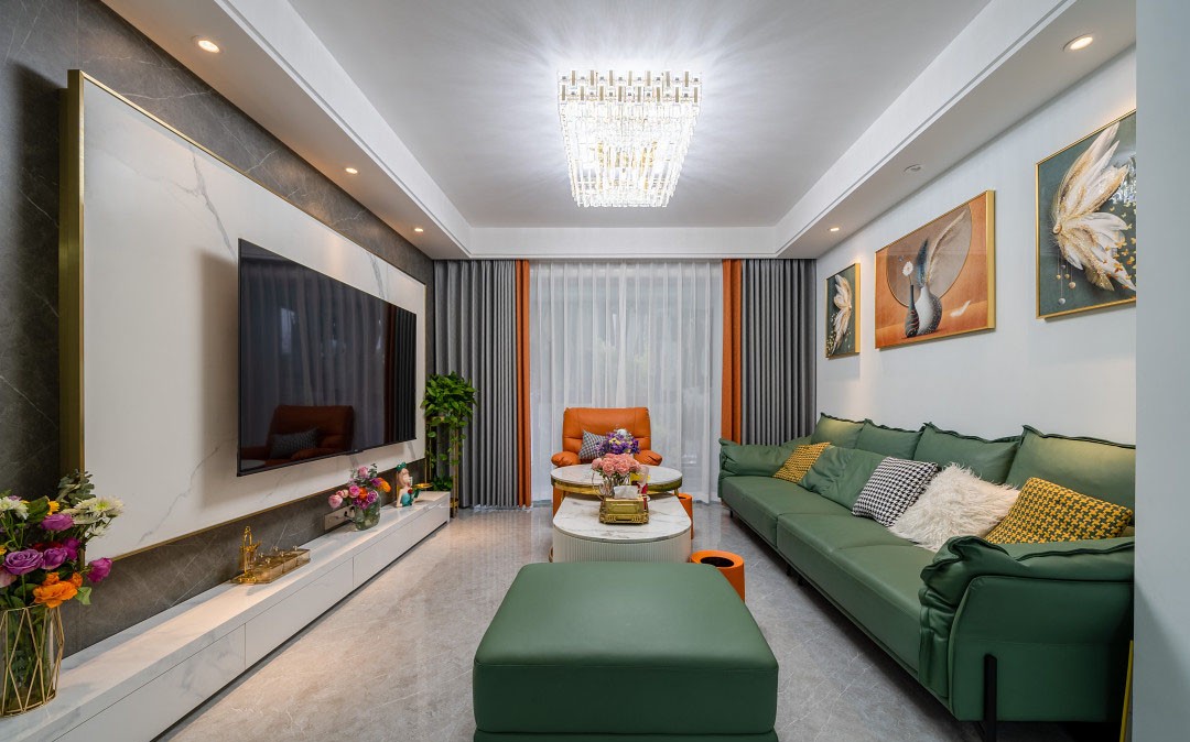 餐椅采用大理石桌面加灰、橙色皮面餐椅,气质简洁