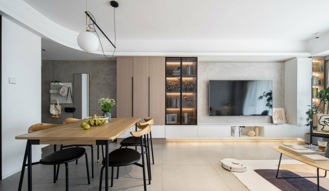 根据需求,设置了餐边柜,白色的柜体与墙面融为一体,视觉上干净整体,做了部分开放处理,预留了插座放置饮水机,让生活更加便捷。
