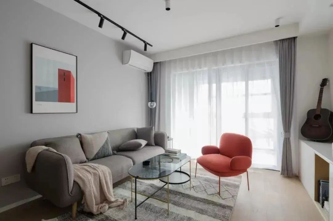 客厅没有主灯,而是选择了更显层高的轨道灯+筒装灯的形式,而且照明也更加均匀。
