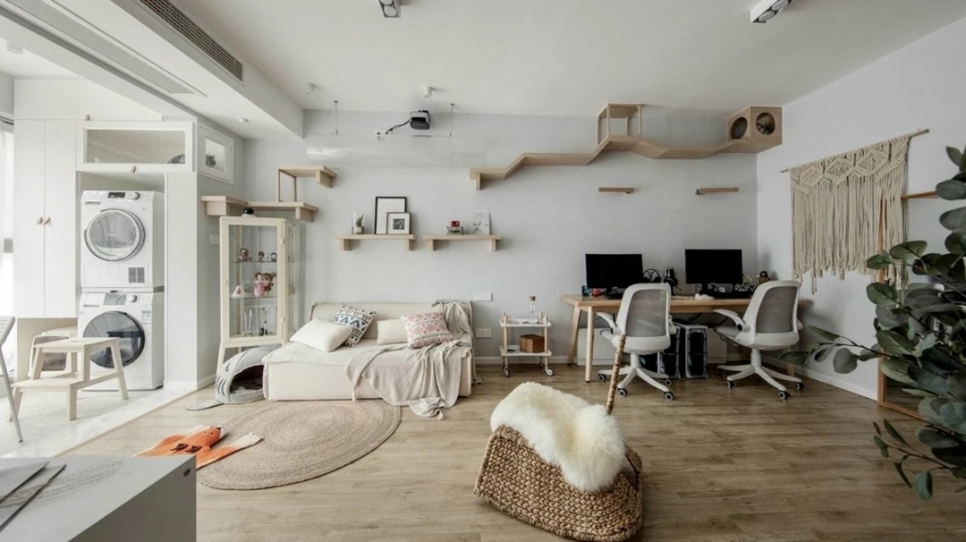 右边则是一组多功能柜,左边的空间是用来收纳杂物的,右边则是用来收纳洗衣机及烘干机的,而顶部则是猫室,并透过猫孔与墙面的隔层相连。