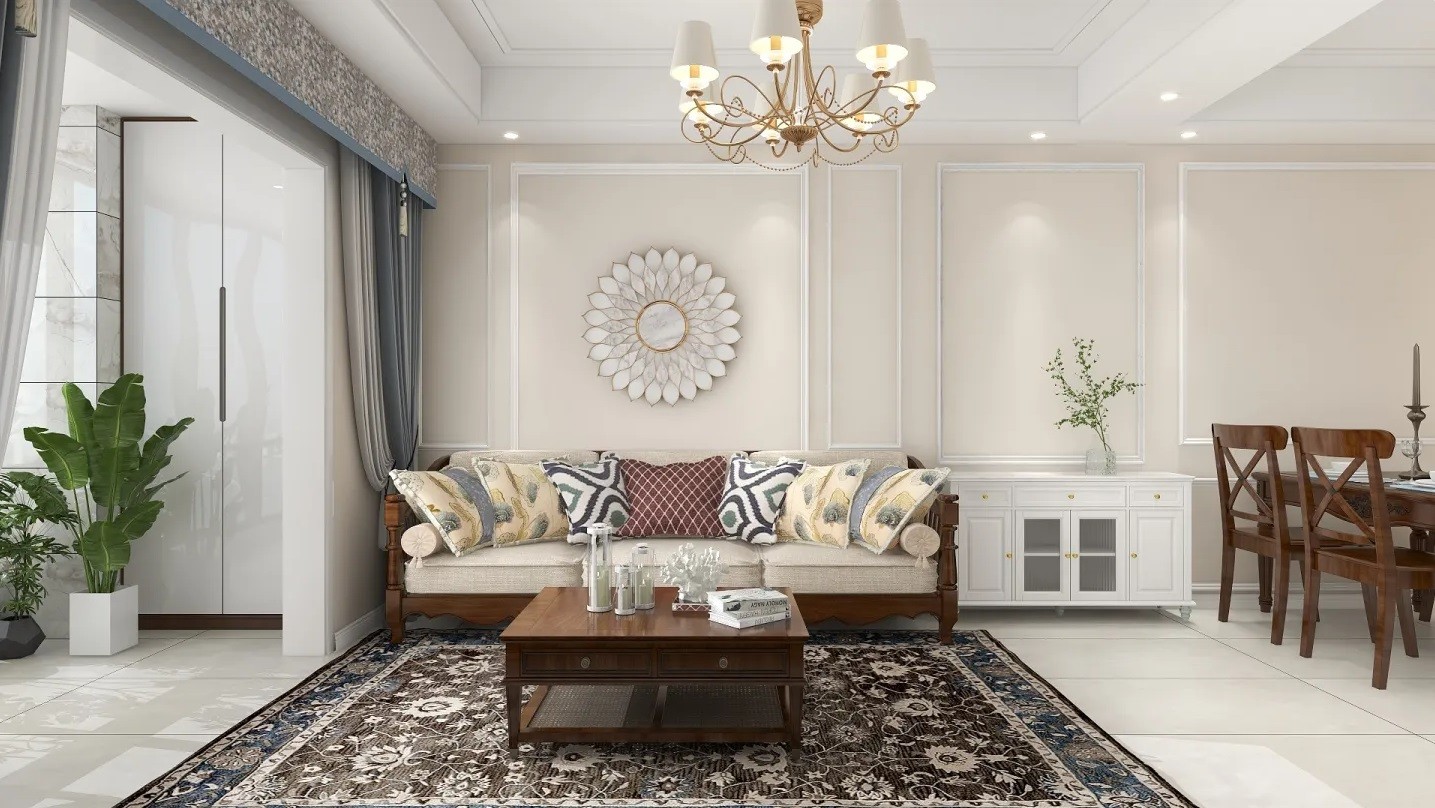 户型是属于三室两厅两卫一厨一阳台的户型,业主是一对年轻的夫妻,喜欢家里是温柔明亮的风格,所以采用几何线条勾勒造型,整体空间采用浅色作为主色调,稍微用亮色进行点缀,整体会有一种舒适柔和的视觉感,搭配上精致的软装又会使整个空间亲切鲜活,为夫妻俩人打造出一个浪漫的轻法式空间。